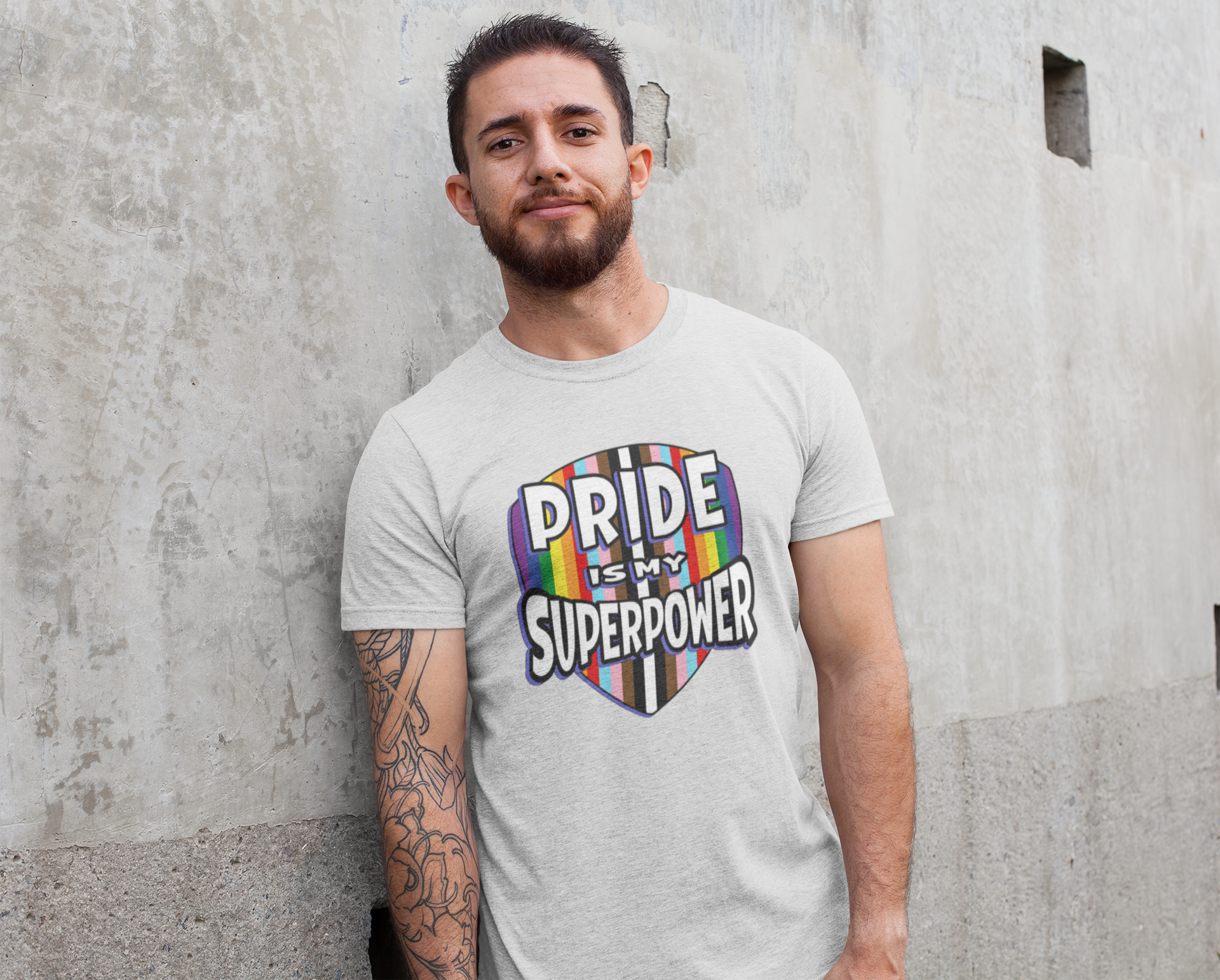 Stand tall, shine bright, and show the world what you're made of with the "Pride is My Superpower" tee from PrideMajic. Featuring a bold superhero shield graphic in Progress Pride Flag colors, this design reminds us all that every identity, every color, every story matters—and together, we are unstoppable.